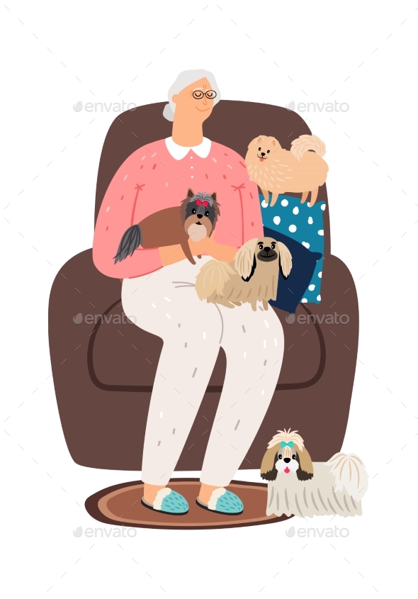 Description: Buy Elderly Dog Lover by ssstocker on GraphicRiver. Elderly dog lover. Old woman sit in chair with little dogs. Shih Tzu, Pekingese, Spitz, Yorkshire Terrier and human v...