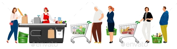 Description: Buy People Queue in Grocery Store by ssstocker on GraphicRiver. People queue in grocery. Food store, people with carts. Waiting line to cashier, man woman elderly want to buy produc...