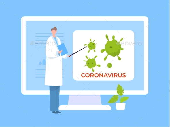 Description: Buy Scientist Explaining About Coronavirus, Concept by elevartun on GraphicRiver. Scientist explaining about coronavirus, concept vector illustration. Man in medical coat shows on screen global disea...